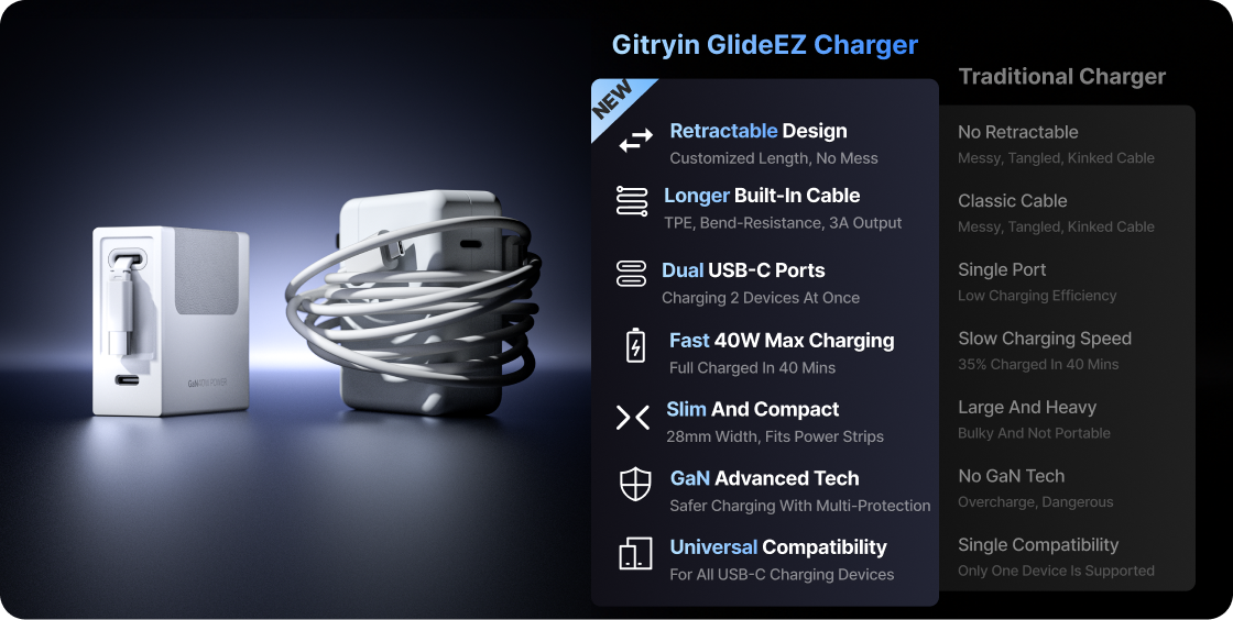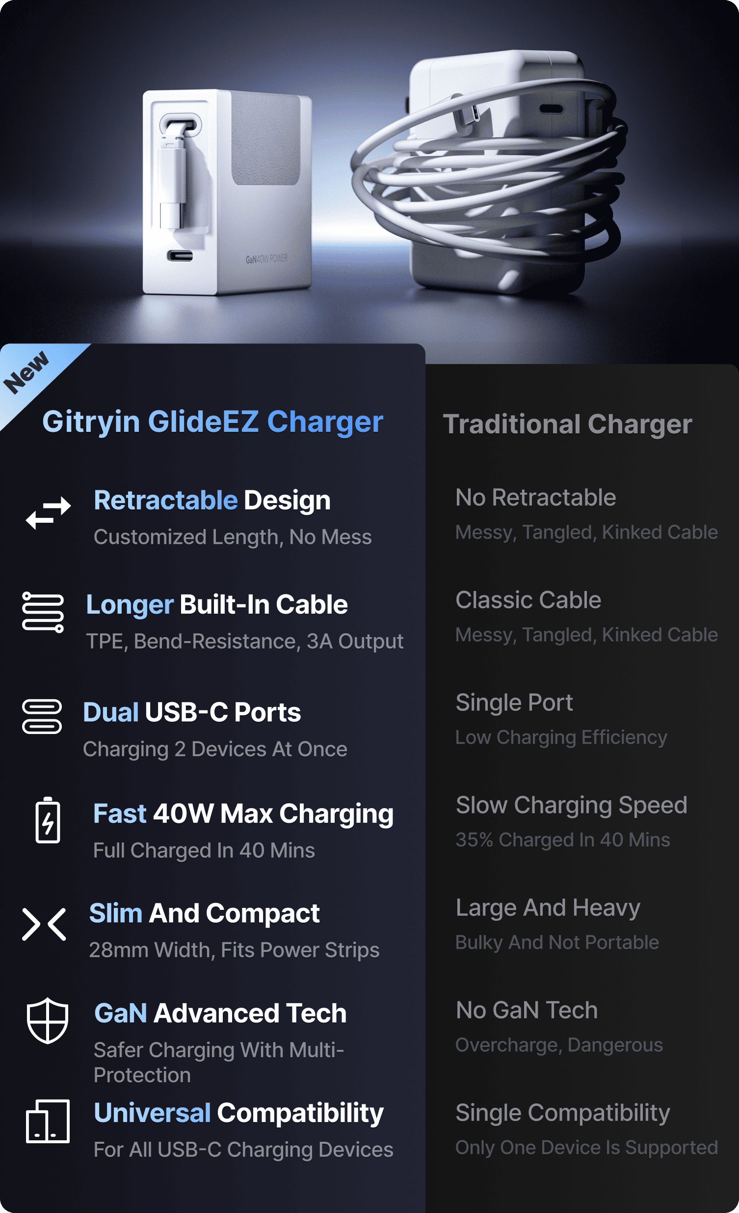 Gitryin GlideEZ Retractable Charger GaN for 3C Devices