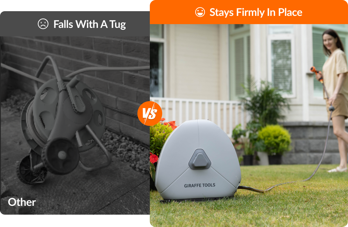 - Wind & Pull-Proof Performance: Forget about tipping holders! Designed with a lowered center of gravity and reinforced joints, our hose reel stays grounded even on concrete after 3,000 pull tests.