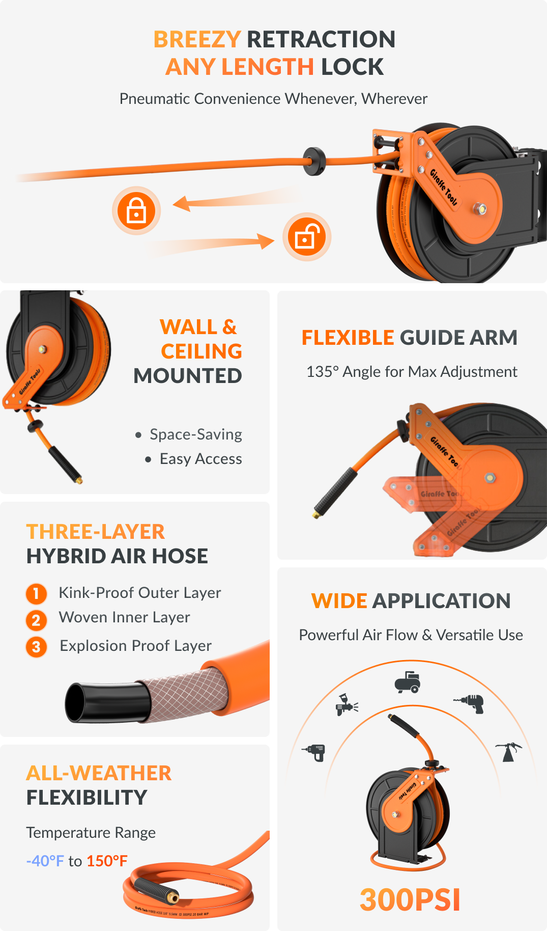 • Premium Retractable Air Hose: 50+3ft oil and abrasion-resistant air hose, this all-weather flexibility Hybrid hose(-40 to 150℉ temperature range)is perfect for year-round use, even in the cold winter.