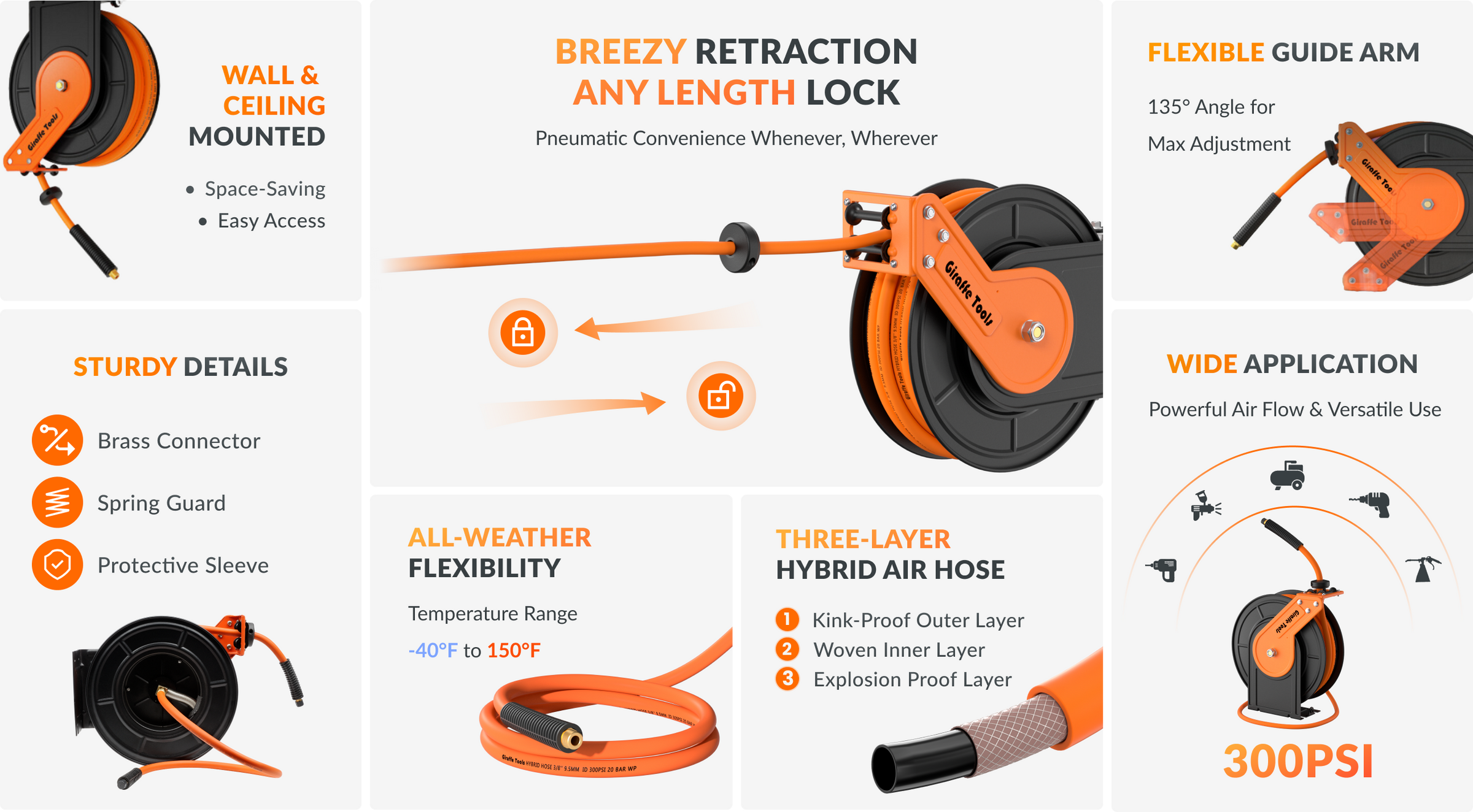 • Automatic Rewind Hose Guide: Simply give the hose a gentle tug and the air compressor hose reel will retract all the way back in without kinks. Equipped with a hose guide system makes the hose fits neatly on the reel.