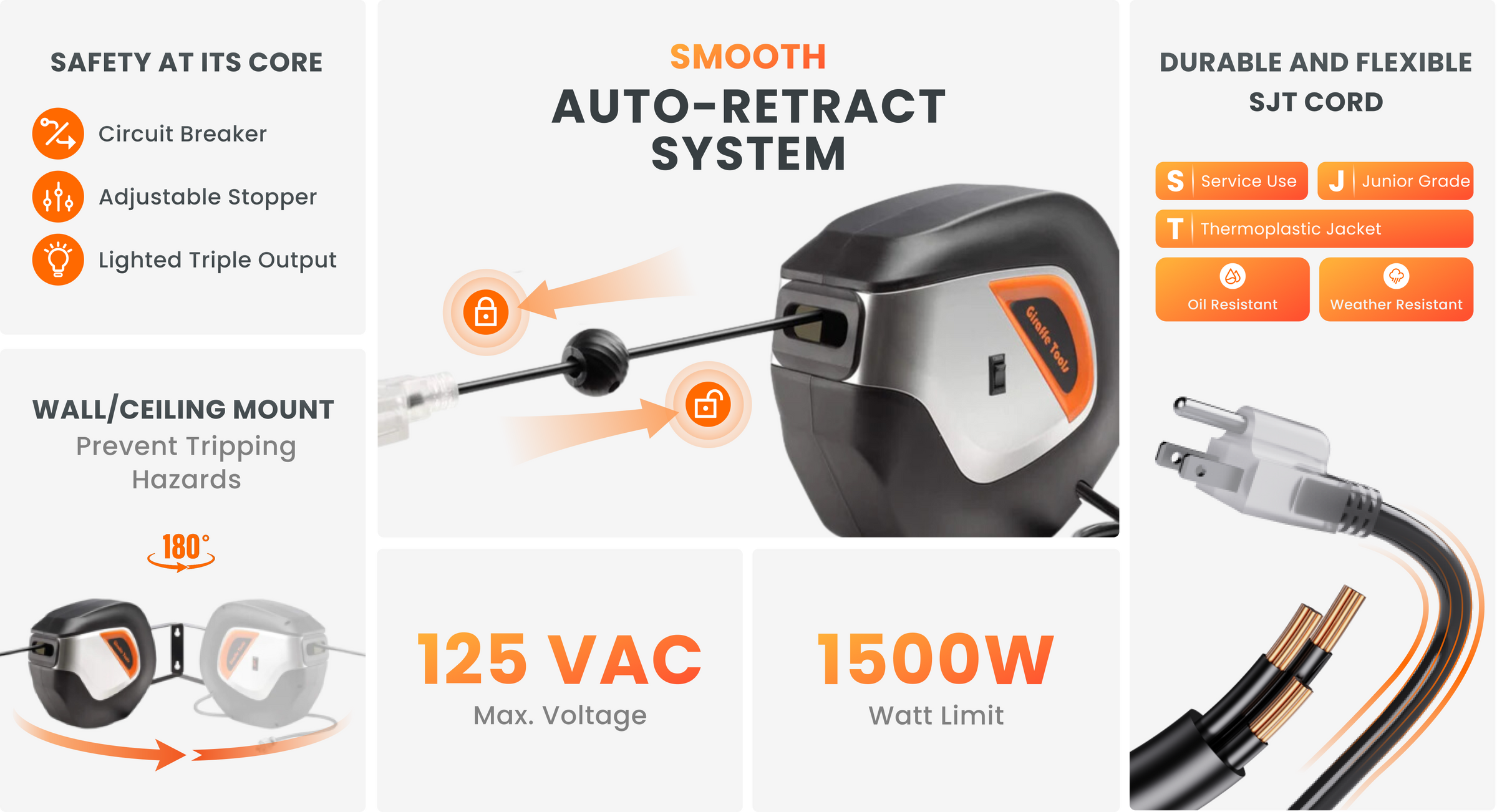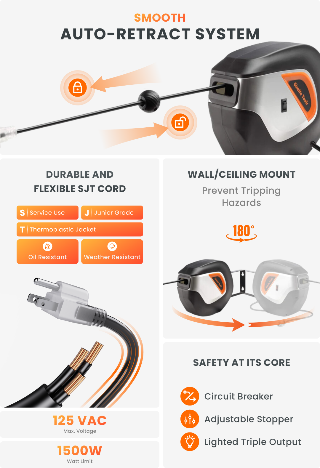 The unique cord reels feature kink-free extension reels, safety circuit breakers, and 3 power outlets with LEDs. Easy to use in any situation and avoid various safety hazards.