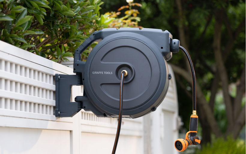 Aesthetic wall-mounted hose reel beautifully complements the scenery of any garden.