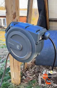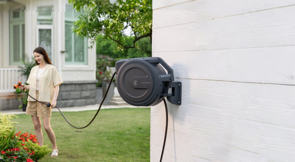 Aesthetic wall-mounted hose reel beautifully complements the scenery of any garden.