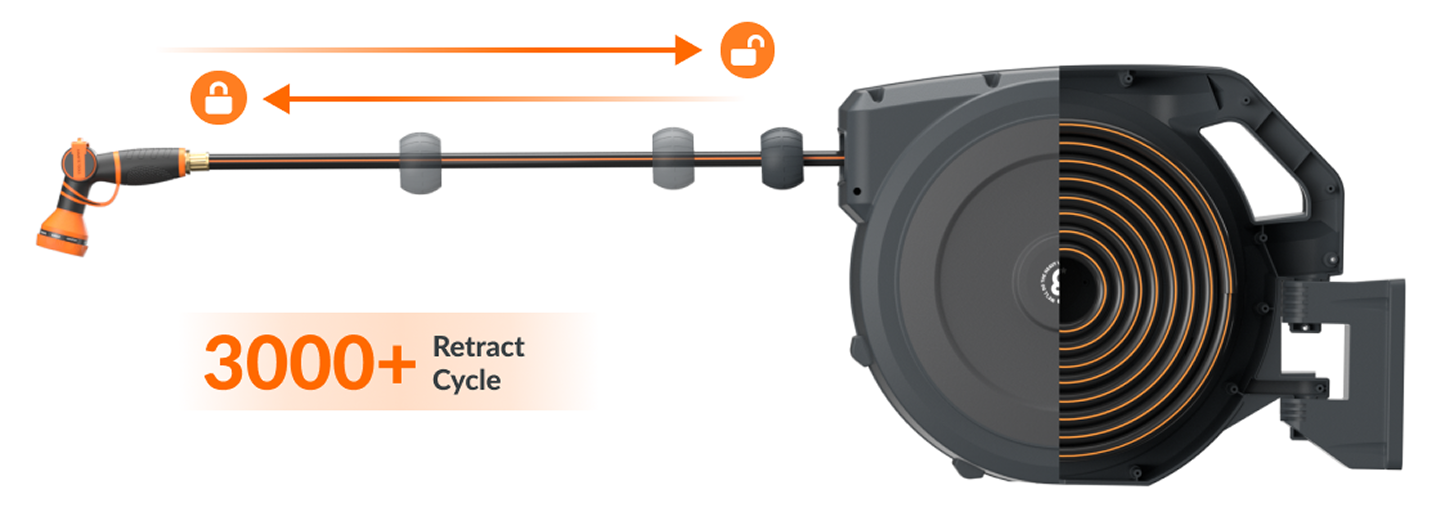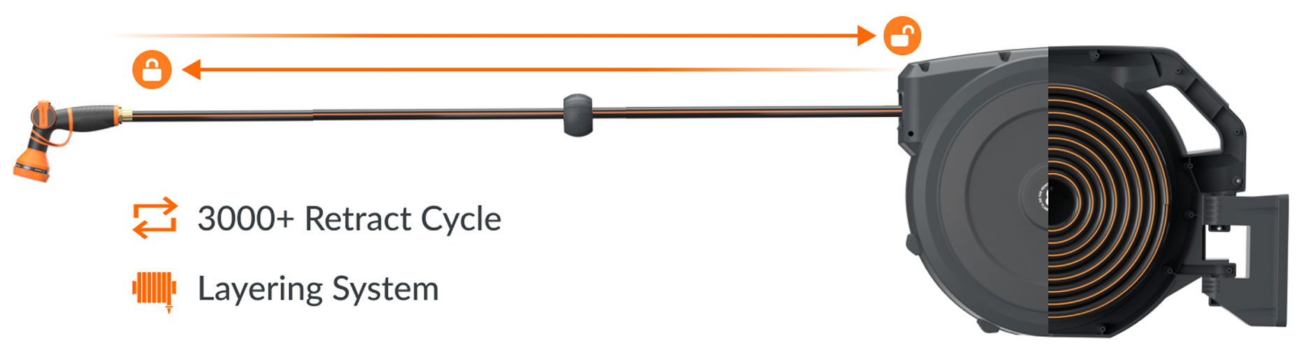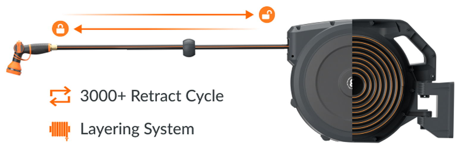 - #1-Reated Retraction, Smooth and Safe: Forget frustrating jams or snapbacks. With our #1-rated retraction system, the hose retracts smoothly and safely with a gentle tug and the adaptive layering system makes the hose winds back neatly - making cleanup quick, easy, and safe for all ages. Built to last through thousands of cycles, it’s engineered for daily use.